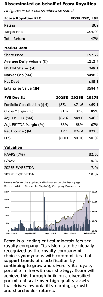 Ecora Royalties with a BUY rating and target price of C$4.00/share.