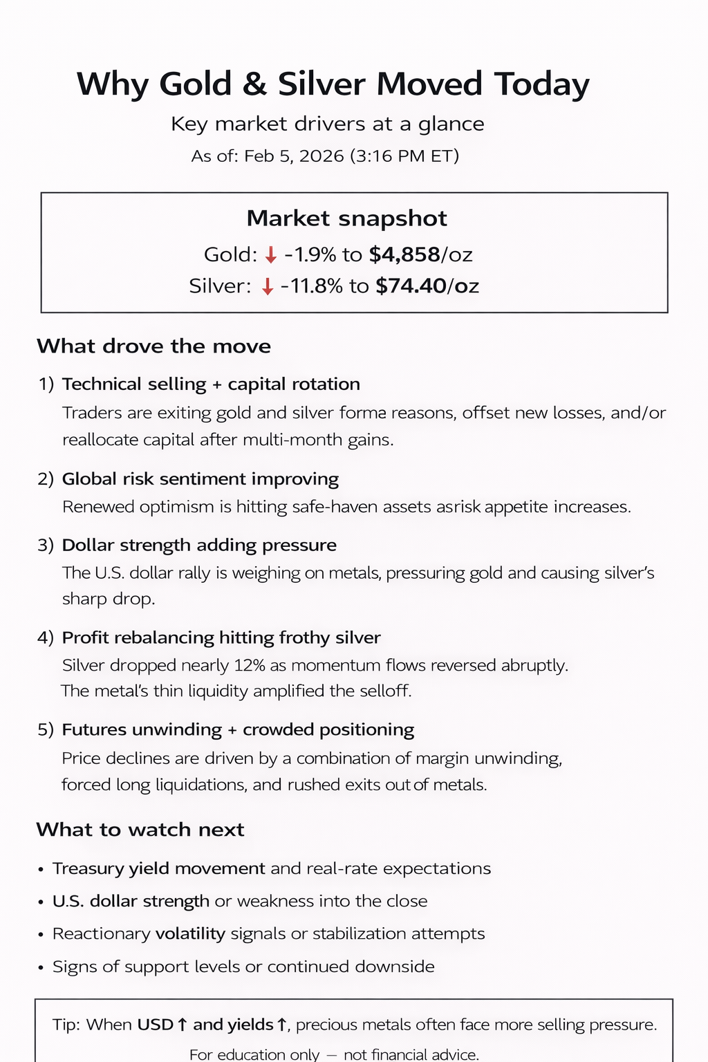 Why gold and silver prices are moving today: key market drivers (Feb 5, 2026)