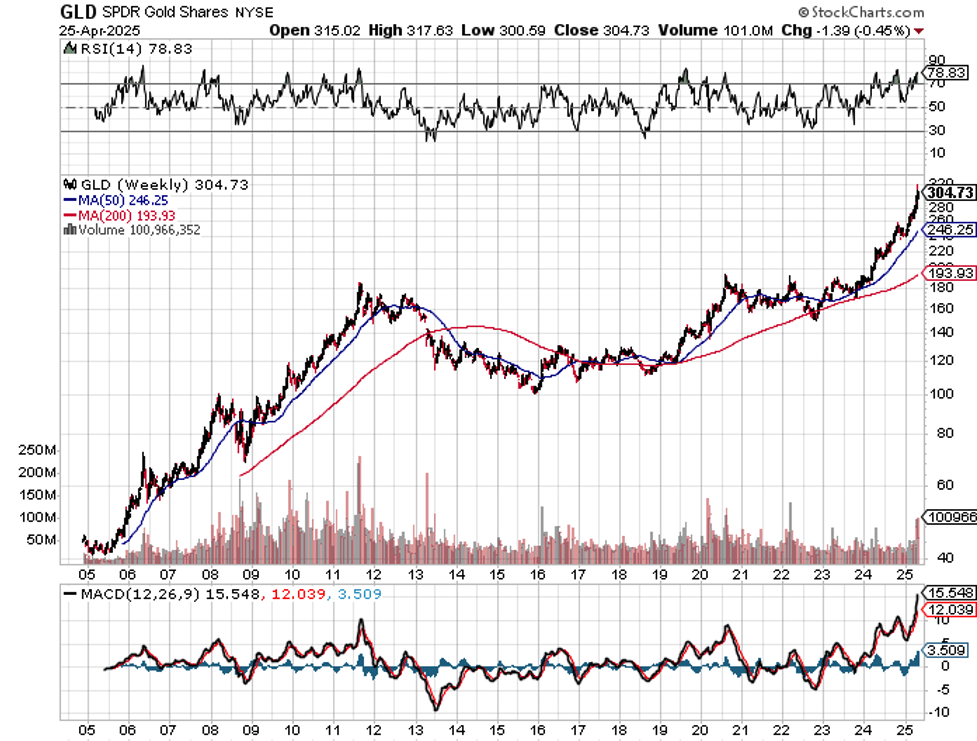 Gold is the asset that has benefitted the most from the latest mess. We have been long gold stocks, and our accounts are up 38% year to date. The following 20-year chart of GLD illustrates a near parabolic advance. We love gold and we are invested in it, but you don’t have to be a financial guru to see that Gold is very overbought. We are not expecting a major top, but a correction / consolidation lasting several weeks or months is now probable. Let’s not get greedy and sell some or hedge some. That is what we are doing.
