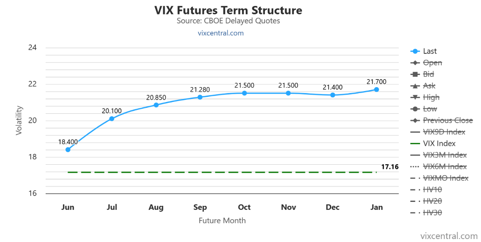 The S&P 500 is close to all-time highs. VIX is at 17. VIX is a bit elevated. The clue lies in the VIX futures, which are significantly higher. In a typical bull market environment, they should be close to the VIX (in the high teens). In other words, the options market is betting on higher volatility over the next few months.