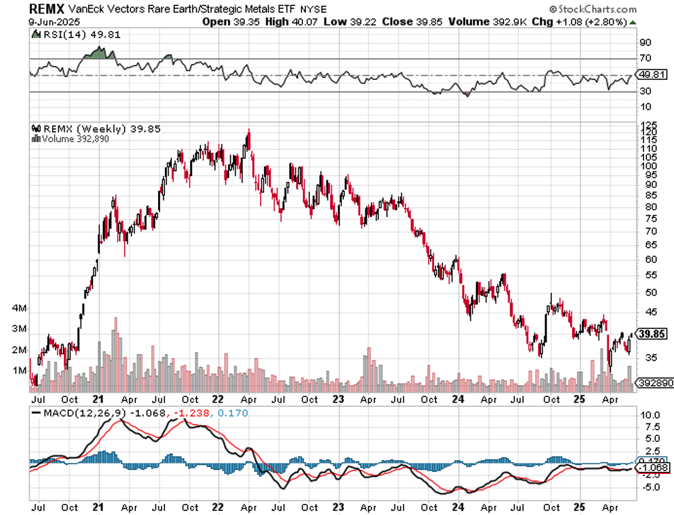 The demand is rapidly growing, while geopolitical tensions can disrupt the supply. It is starting to look like a lucrative investment. The chart below of REMX (rare earth metals ETF) shows how out of favor this industry has been. We believe it is overdone on the downside. We are long-term investors in Earth Metals and will hold them as such. The consolidation period over the last few months represents an accumulation opportunity.