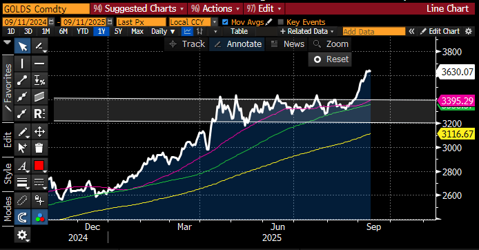The consolidation channel we witnessed for the majority of the summer was such a positive sign. Everyone was mad that gold wasn’t moving higher every day like in the spring but I was beating the drum that this was the most positive pause you can get. Usually when commodities or stocks take a “break” they actually revert and trade lower for a period of time. And sure enough it took very little to juice the price to a new level and change the landscape for companies/stocks yet again.