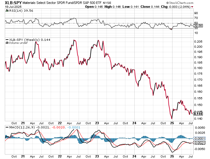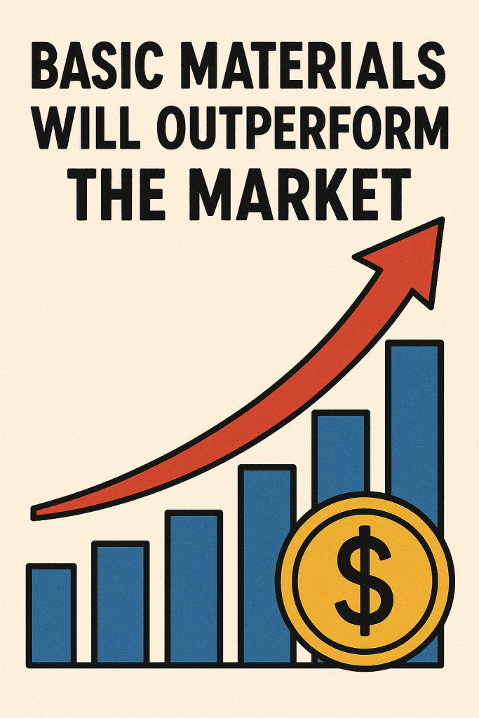 The basic materials sector has been underperforming the market for several years. Here is the chart of the ratio of XLB (Basic Materials Sector ETF) vs. SPY. We believe that this trend is about to reverse. The bullish case for the Basic Materials sector rests on a convergence of macroeconomic, geopolitical, and structural factors that enhance demand and pricing power for core commodities. Here’s a breakdown across three thematic pillars: