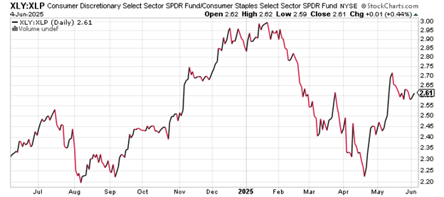 There are indicators that show us where the money is flowing. Intermarket relationships may provide some subtle clues. A notable example is the ratio between consumer discretionary stocks (risk-on) and consumer staples stocks (risk-off).