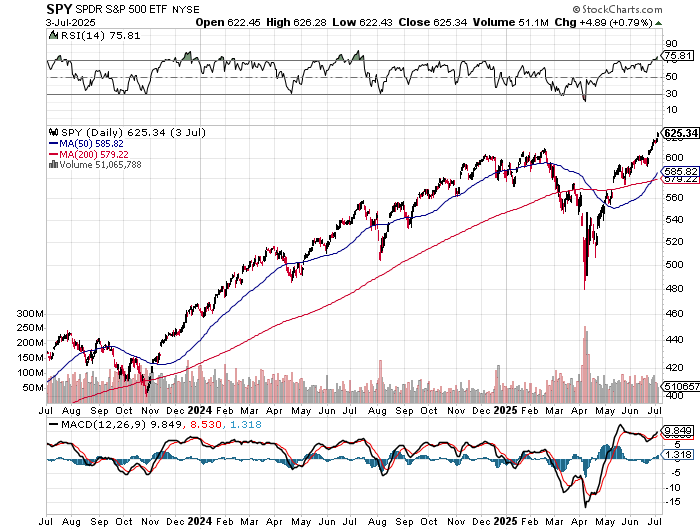 Meanwhile, on a short-term basis, the market is simply overbought. Take a look at the RSI indicator on the chart below. Readings of 75 and above usually produce either intermediate-term corrections or short-term pullbacks. That’s where we are. While overbought conditions don’t typically start bear markets, we believe they signal the beginning of problems that eventually lead to the next bear market.