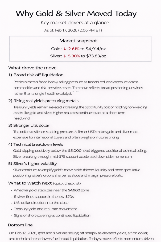 On Feb 17, 2026, gold and silver are selling off sharply as elevated yields, a firm dollar, and technical breakdowns fuel broad liquidation. Today’s move reflects momentum-driven positioning pressure rather than a structural shift in the longer-term metals narrative — but near-term volatility remains elevated.