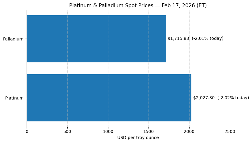 On Feb 17, 2026, platinum and palladium are both weaker, with benchmark pricing down about ~2% on the day.
