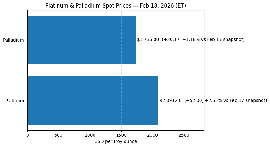 Feb 18, 2026: platinum is $2,091/oz and palladium is $1,736/oz, with both up vs yesterday’s JM Bullion snapshot.
